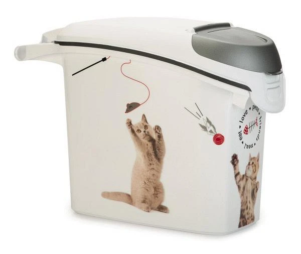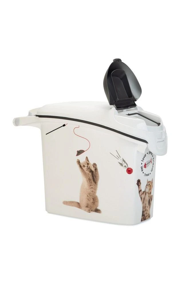 De container bevat een klepje aan de bovenkant, zodat je de brokjes gemakkelijk in een kattenvoerbak kunt schenken. Voorzien van een handvat, zodat je de voedselcontainer gemakkelijk kunt verplaatsen. Leuk detail: voorzien van diverse kattenprints.