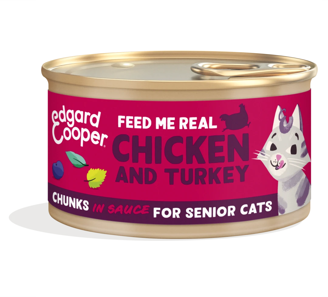 Edgard & Cooper kattenvoer Senior Kip en Kalkoen Chunks in saus zijn malse stukjes vrije-uitloopkip en kalkoen overgoten met een saus. Dit is een recept met echt eten zonder junkfood: boordevol magere eiwitten, L-carnitine voor het behoud van spiermassa en taurine die de ogen en het hart van je senior gezond helpen houden.